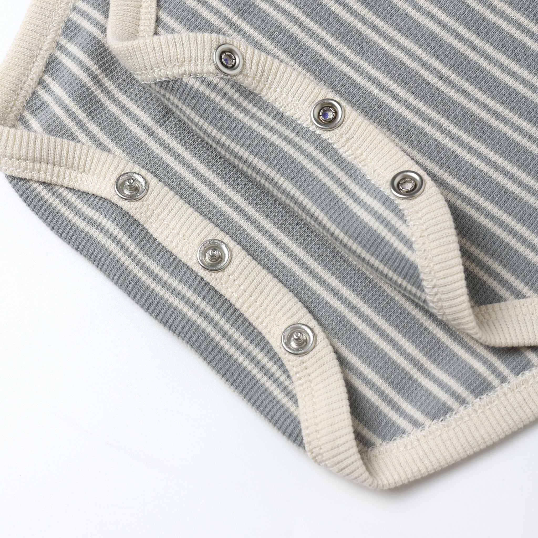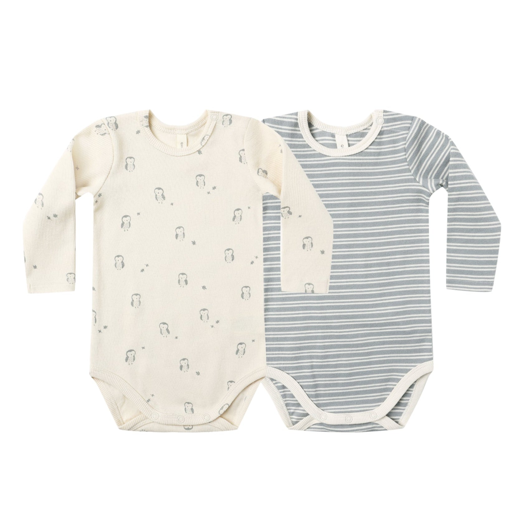 Quincy Mae - Organic Ribbed Long Sleeve Bodysuit (2-Pack) - Steel Blue Stripe + Owls