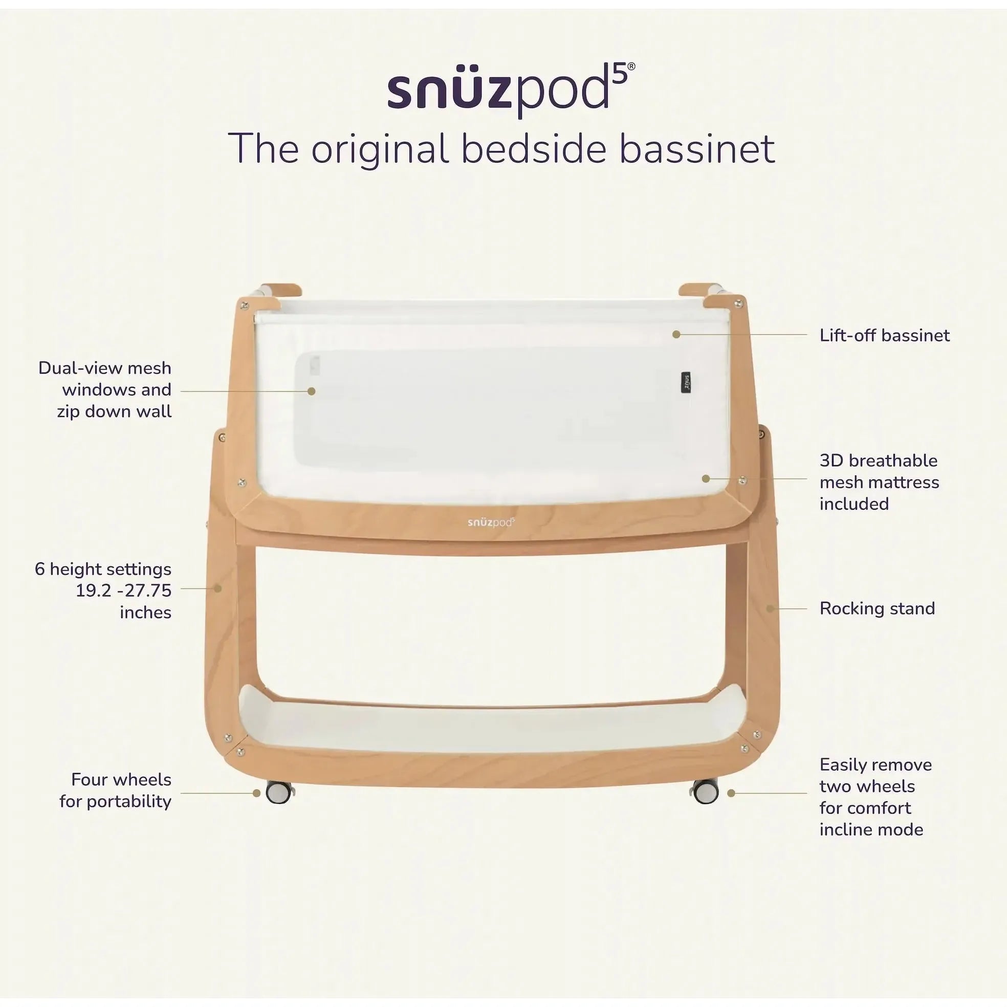 - SnuzPod5 bedside bassinet complies with both CPSC and Baby Safety Alliance certification.
