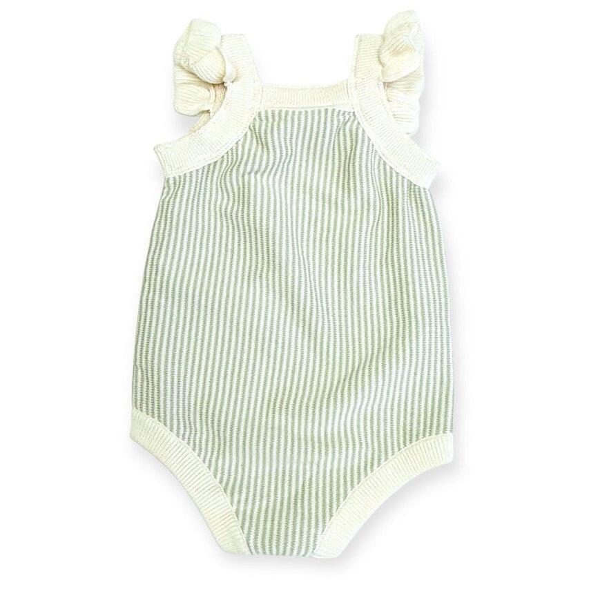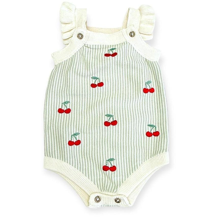 Sweet as Cherries and cozy with organic cotton - this romper is perfect for your little sunshine! This baby romper features vertical green and cream stripes with delicate cherry stem embroidery across the front. The overall-style tank romper is finished with buttoned straps, soft ruffles, and two bottom buttons for easy diaper changes.