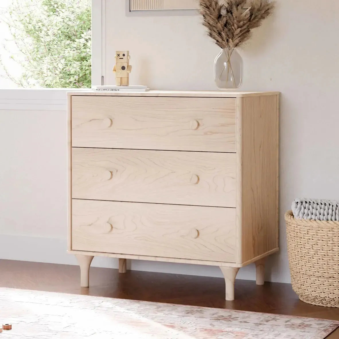 Enjoy the playful modern design of the Lolly 3-Drawer Changer Dresser! With natural curves and delicate natural feet that compliments the Lolly 3-in-1 Convertible Crib. Designed especially for the nursery with an included removable changing tray, smooth-glide drawers, hidden hardware, and included anti-tip kit.