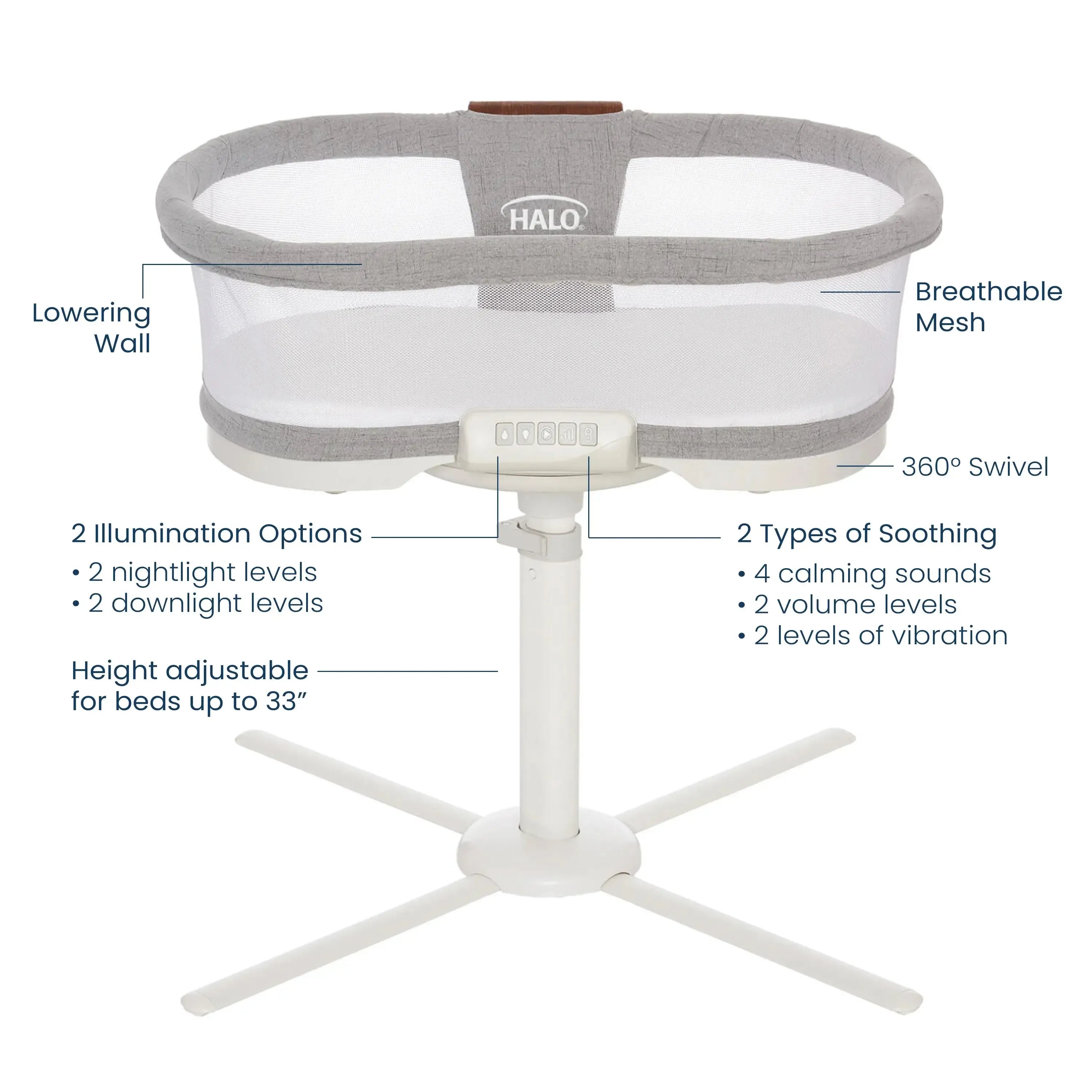 Designed for better sleep for everyone, the BassiNest Luxe offers HALO’s signature safety, closeness, and convenience with a premium, elevated design. Its sleek, space-saving base glides under beds with lower clearance, while the 360° swivel and lowering wall bring your baby close for effortless nighttime care.