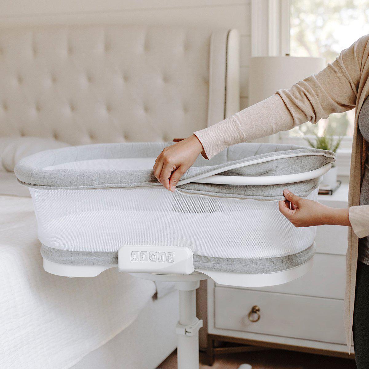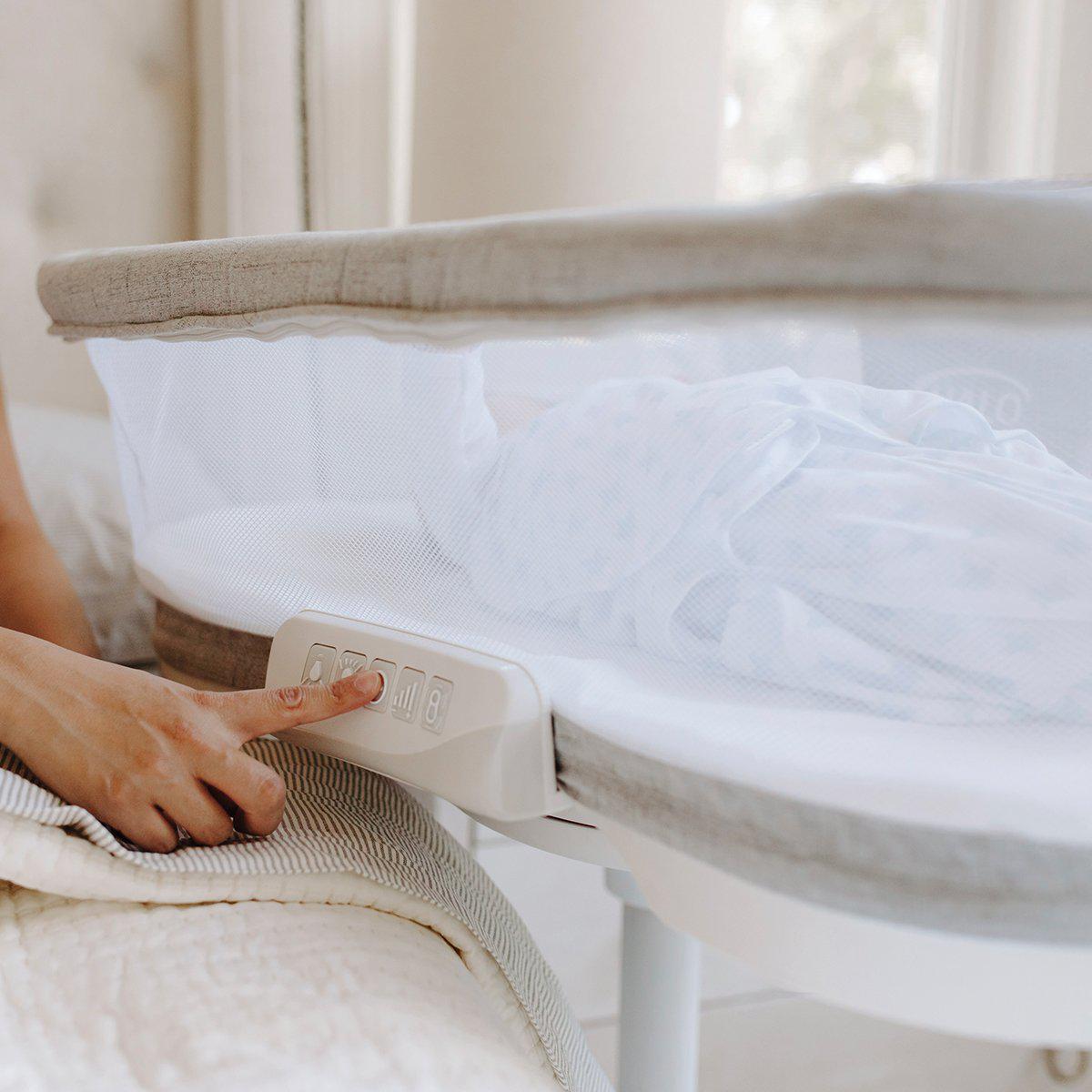 Luxe goes beyond comfort with a built-in soothing center featuring vibrations, calming sounds, and an adjustable nightlight. Breathable mesh walls provide airflow and visibility, and a built-in storage caddy keeps essentials within reach—so you never have to leave your bed. Plus, it converts into a portable nest, keeping your baby close day and night.
