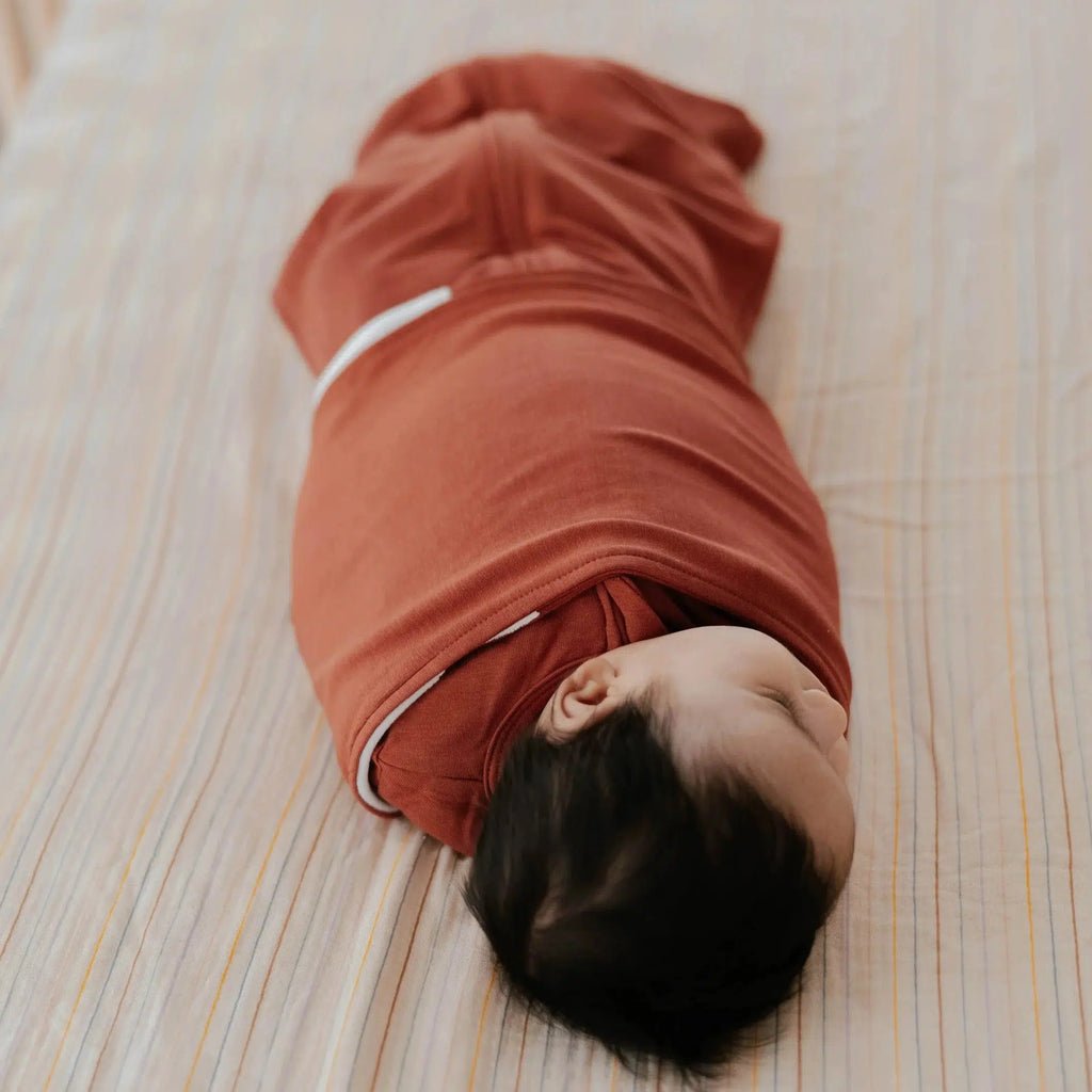 Newborns generally respond well to being swaddled. The snug bundling technique can help your baby feel safe and soothed like they’re back in the womb. A cotton or muslin material is a good choice, as both are lightweight and breathable and offer ample flexibility for easy wrapping.