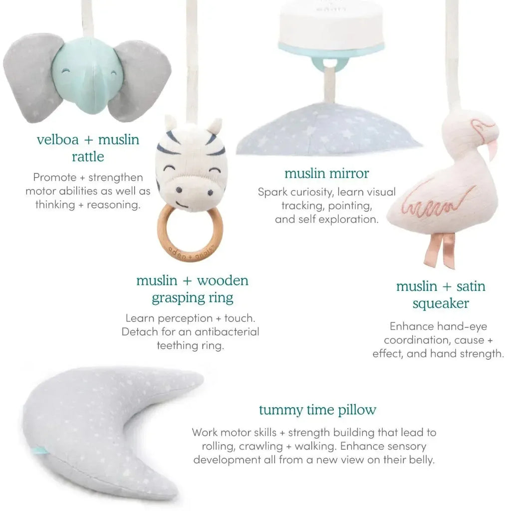 • Includes 3 interactive toys, a mirror, and oversized tummy time pillow