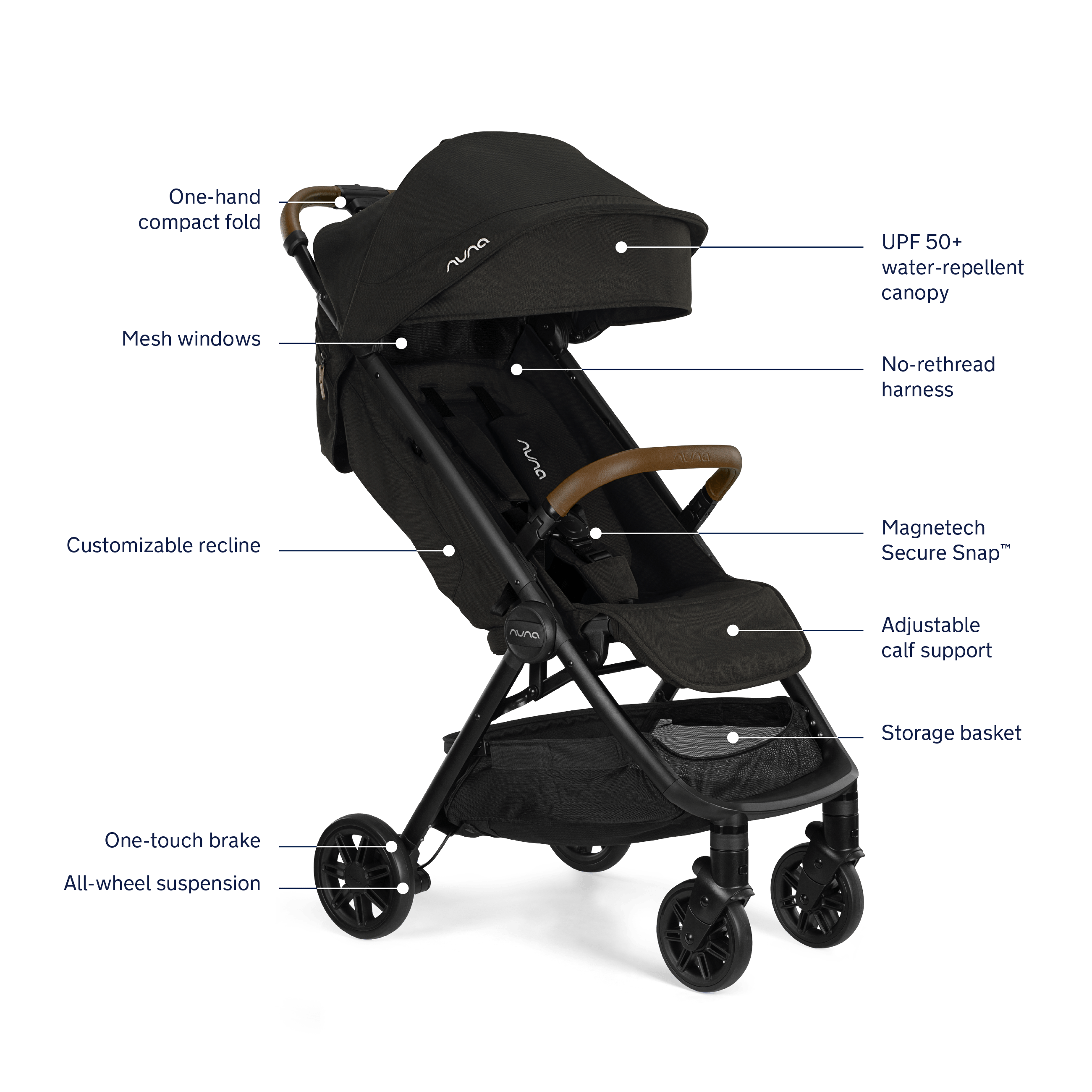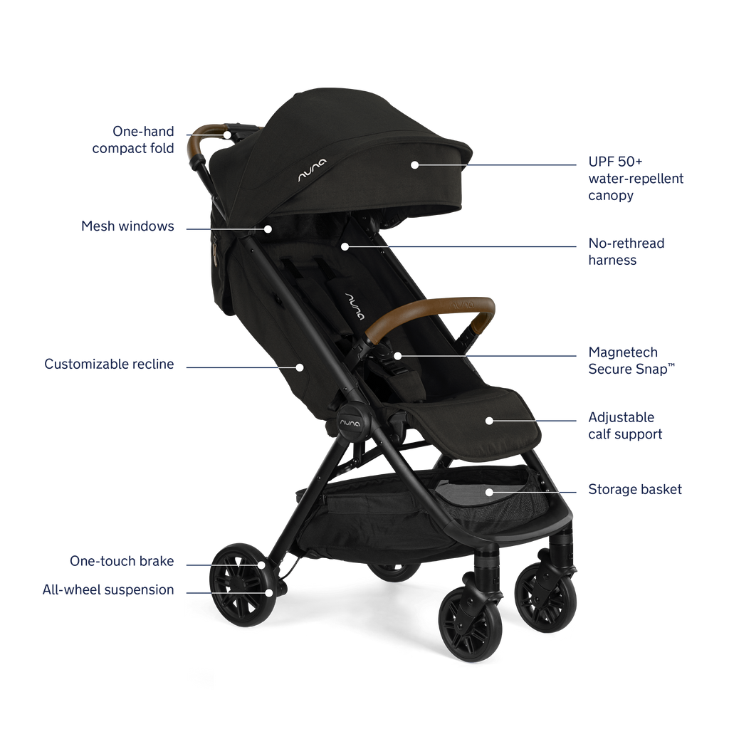 Out around town, on a whirlwind weekend trip, or exploring faraway places - an extra hand is always helpful for any parent. At the touch of a button on the push bar, the Nuna TRVL stroller self-folds into a super-compact, free-standing package - giving you the convenience and mobility you need to discover the world in style.