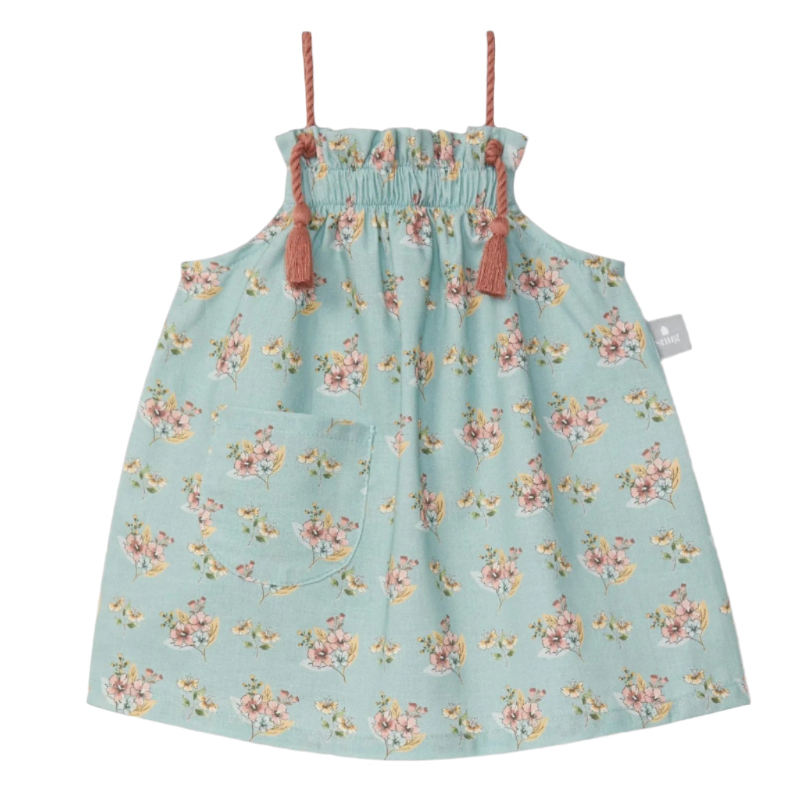Dress in cool and comfortable fabric with 100% cotton floral print. Elasticity in the chest and back for greater comfort. Drawstring straps colour contrast fasten with knot for better adaptation to growth. Functional pocket on the front.